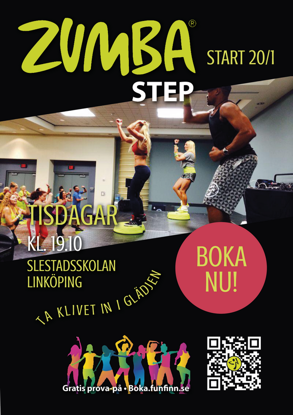 Ta klivet upp och in i glädje varje tisdag kl. 19.10 våren 2026 med Zumba® Step-dans! Lokal: Slestadsskolans gymnastiksal i Lambohov, Linköping, på adress Rättaregatan 120. Uppstart den 20 januari 2026 med sammanlagt 14 tillfällen t.o.m. den 28 april, med uppehåll den 31 mars (påskveckan).